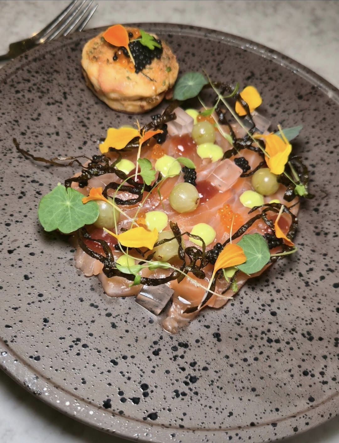 - Black Tom Gin & Dulse cured salmon with toasted English muffin & smoked roe butter