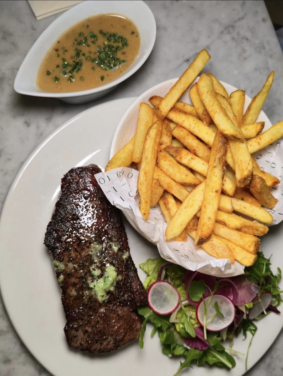 - 10oz Pan Roasted Sirloin with garlic & parsley butter, house pickle salad, skin on fries & Stilton & chive cream sauce