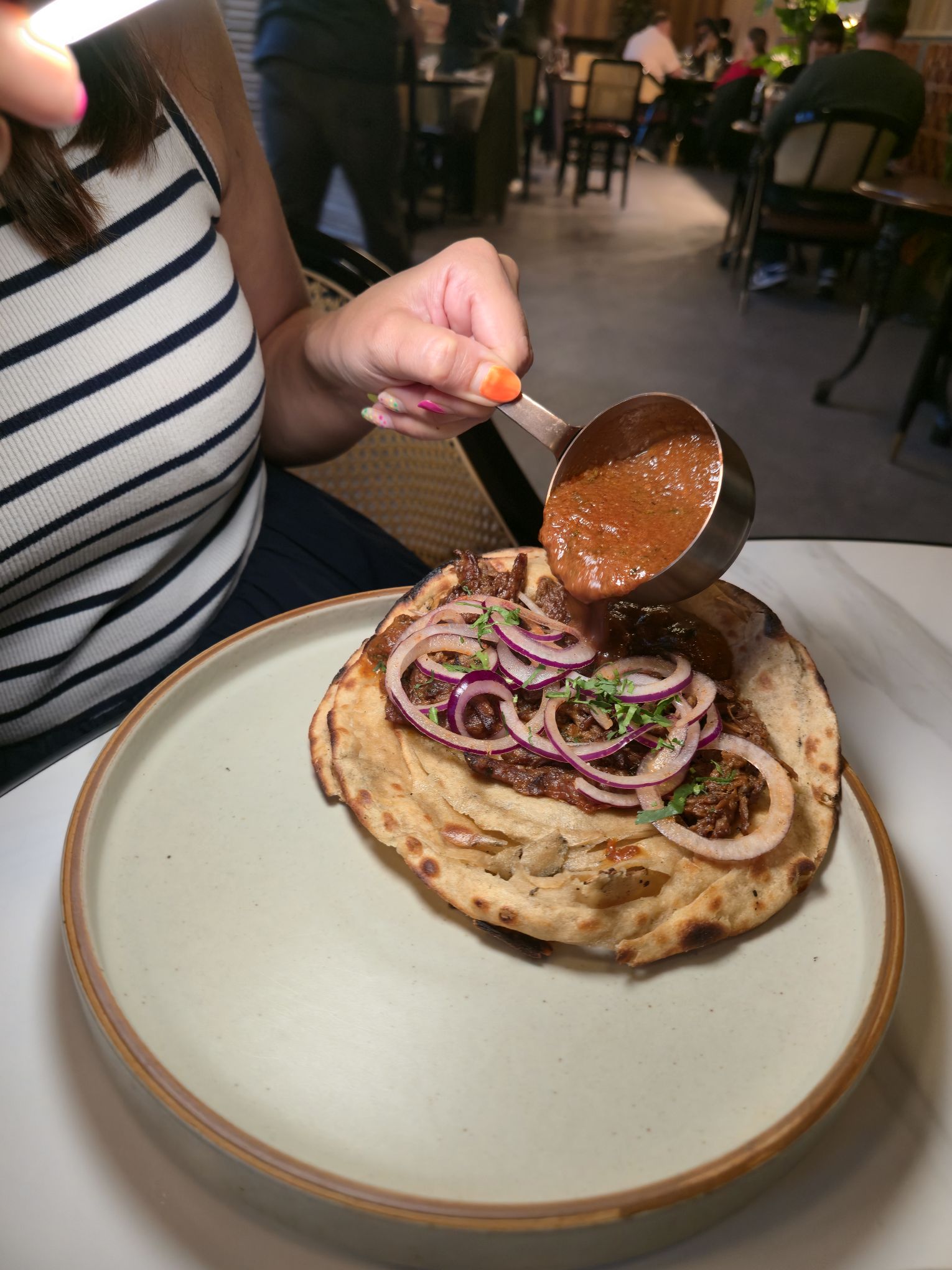 - Sikandari Kid Goat Shoulder served in flaky layered parathas with tangy onions and a rich, curry sauce β this was something different. The meat was rich and liked pulled meat consistency. Very flavoursome and authentic.