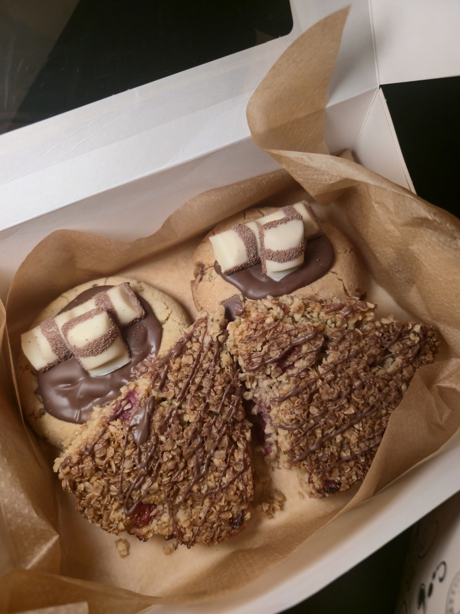 We tried; Strawberry flapjack, Kinder Bueno cookie, blueberry crumble muffins and a slice of Lotus Biscoff milk cake 🤤👌🏼