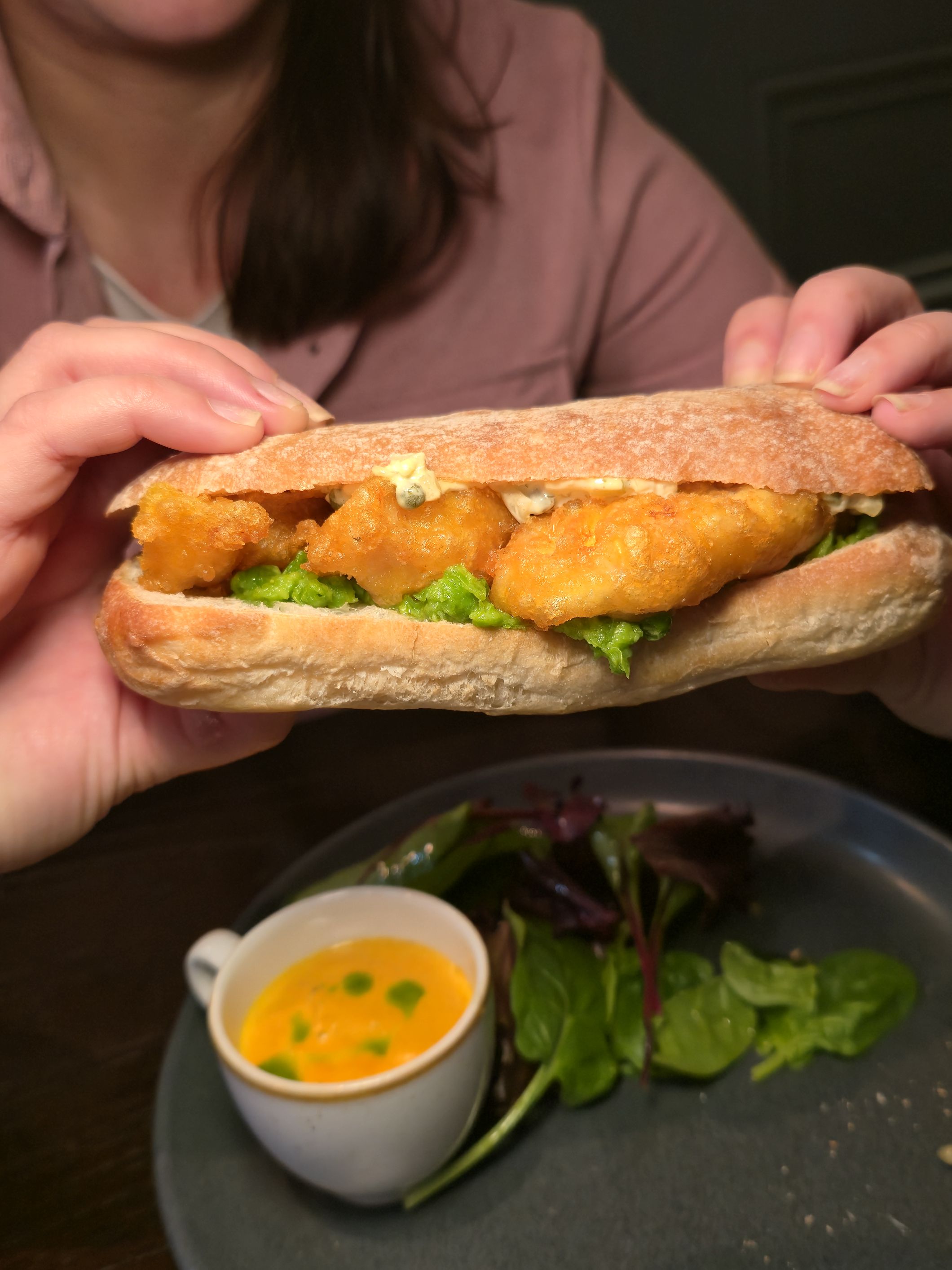 • Fish Finger Sandwich, with tartare sauce, crushed peas & a carrot and coriander soup